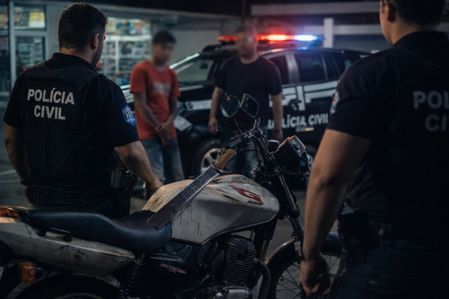 Durante a abordagem, os policiais localizaram com um dos envolvidos um facão, posteriormente identificado como objeto furtado de um supermercado da cidade. O item foi apreendido e devolvido ao estabelecimento, avaliado em cerca de R$ 34,00.