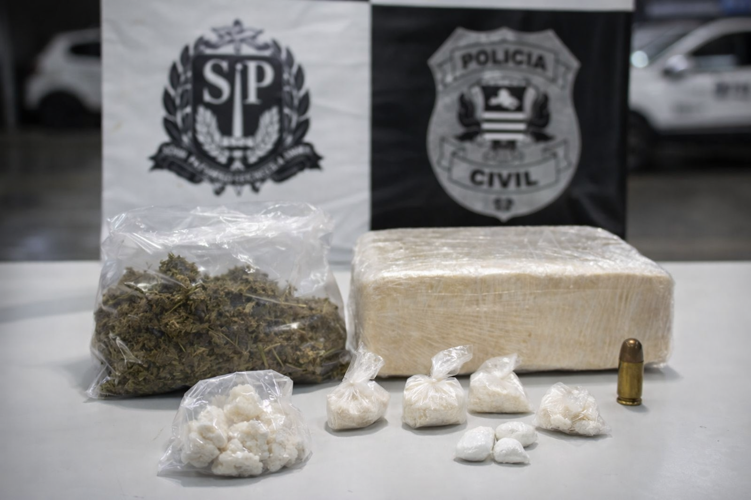 Segundo o registro policial, foram apreendidas porções de maconha totalizando aproximadamente 40,57 gramas, além de duas pedras de crack, somando cerca de 1,68 grama, e quatro porções de cocaína, incluindo uma porção maior conhecida como “tijolo”, que totalizou 190,48 gramas da substância.