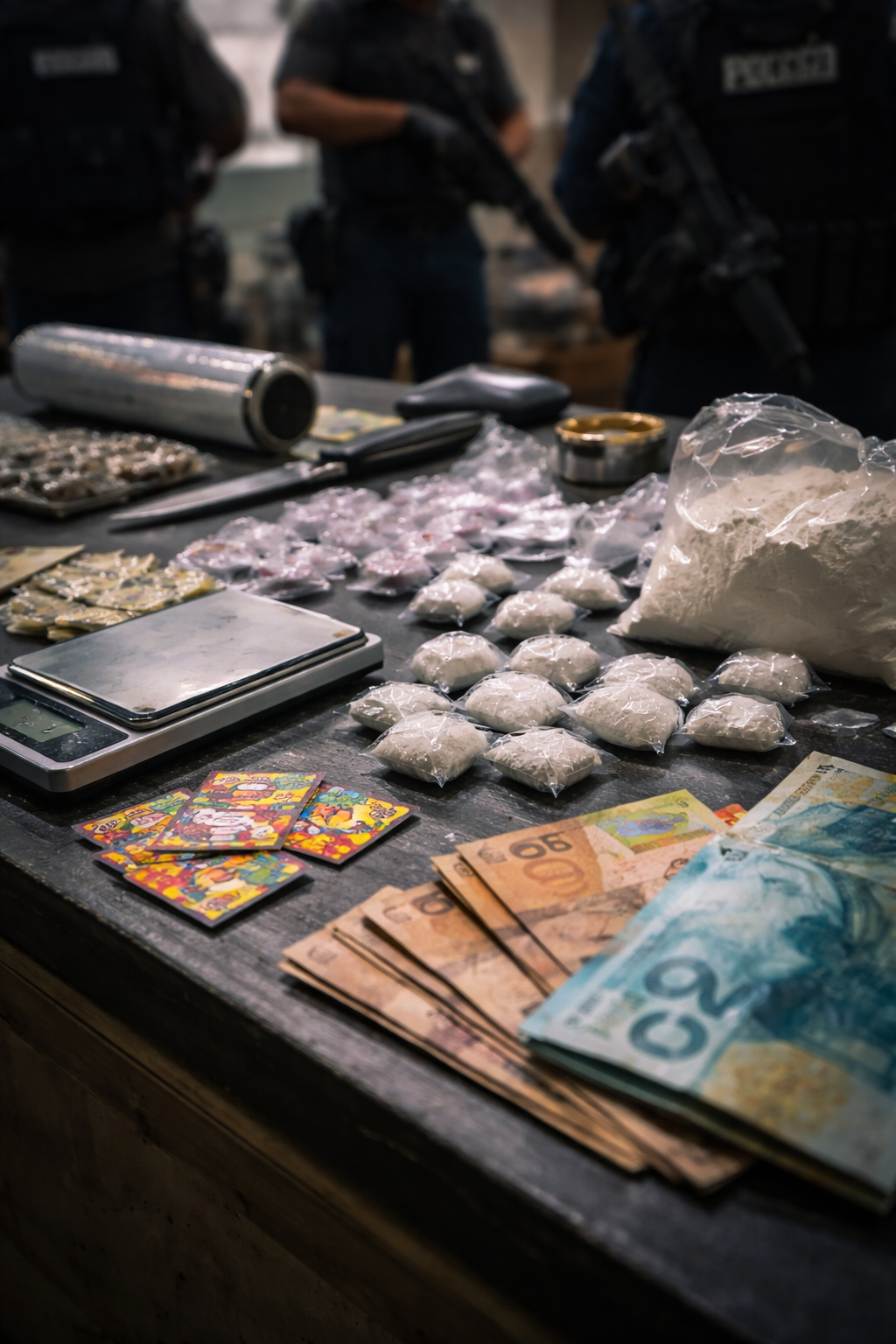 No documento policial, constam apreensões de porções de cocaína e também de LSD, associadas aos envolvidos na ocorrência. Após a análise dos elementos apresentados e da constatação da natureza ilícita das substâncias, a autoridade policial determinou a lavratura do auto de flagrante.